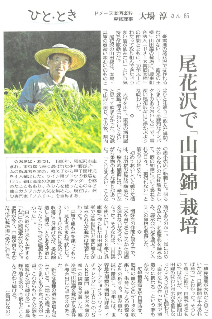 農事組合法人ドメーヌ楽酒楽粋は酒米「山田錦」を北限の地山形で栽培して地産の山田錦で日本酒を醸したい思いで10年以上試行錯誤しながら携わってまいりました。そんな経緯をこの度読売新聞【ひと・とき】に取り上げて頂きました。誠にありがとうございました。